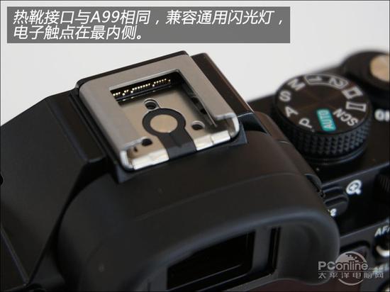 热靴接口,索尼微单?A7采用的是与A99相同规格的新型设计,支持通用热靴的闪光灯,数据交换在热靴内侧。