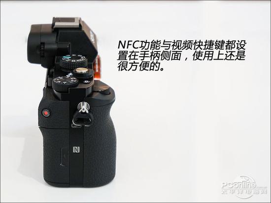索尼微单?A7搭载了NFC功能,同样设计在手柄的右侧,一触即连的功能很方便,视频拍摄键设计在机背手柄的侧面,这个设计第一次见,没有以往设计在机背那么顺手,不过拇指启动该键也不需要改变握机手势。