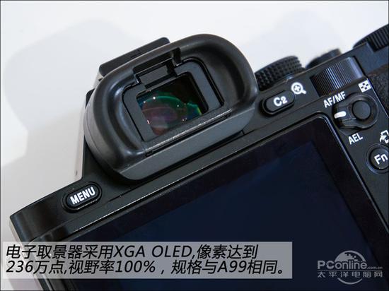 索尼微单?A7系列实用的是XGA规格的电子取景器,与A99配置相同,显示效果细腻,与光学取景器相比也不为过了,刷新帧率等也比过往的产品要好。取景器设置在机顶中央还是头一次,尖顶的设计也尽显复古的味道。
