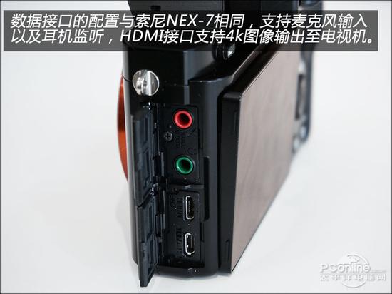 索尼微单?A7的数据接口配置上与NEX-7相同,不过HDMI接口支持4k图像输出至电视机,未来4k规格的设备普及后,这又是一个走在前沿的设定。
