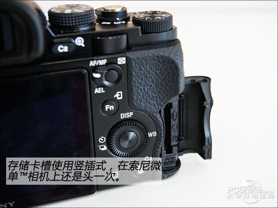 索尼微单?A7的尺寸为126.7×94.4×48.2mm,宽大的手柄、三个多功能转盘外加模式转盘和曝光补偿转盘,提供快速操作的项目非常多,自定义按键也在NEX-7的基础上再增加两个。 三、索尼微单?A7局部细节