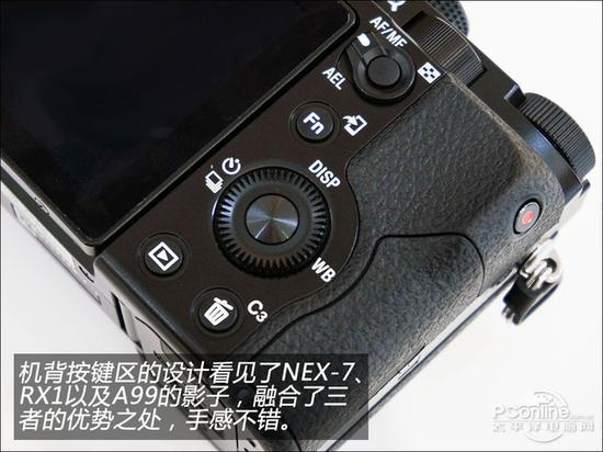 机背按键,索尼微单?A7融合了RX1、NEX-7与A99的一些设计元素,宽大的手柄握起来像NEX-7,按键以及转盘设计采用了RX1的样式,而诸如对焦模式拨杆的设计,又沿用了A99,三者整合后的使用手感倒是也不错。