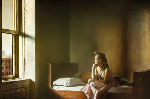 房间总是空空荡荡,只有这个女人在四处游弋。 斯文森的作品让人联想起,20世纪90年代,美国小说家艾拉·莱文曾在作品《偷窥》中描述了一个窥视狂,只不过这个人是用监视器,而非相机镜头对公寓中发生的一举一动进行监控。主人公曾这样描述自己监视庸常生活的动机:“生活本身,真真切切发生的事,这是给上帝看的肥皂剧。不管怎么说,这就是生活的碎片。没有女演员、男演员,没有导演,没有作者或者编辑,还没有广告。” 爱德华·霍普:他定义了我们看向自己的目光 第三个故事,关于美国画家爱德华·霍普。王尔德曾说:“在詹姆斯·惠斯勒画伦敦之前,伦敦没有大雾。”同样的情况也发生在霍普身上,在他画汽车旅馆和小公寓之前,这些地方在人们眼中了无生趣。 霍普的城市,一般是纽约,都有着生锈的屋顶管道和烟囱、钢铁桥梁,以及苍白的电灯,铁路和火车也是霍普喜欢的题材,他说:“我总是对乘坐火车接近一座大城市感兴趣,我不能完全描述那种感觉,但它们是完全关于人的,或许与美学没有任何关系,当一个人进入大城市时,他会感到恐惧和焦虑,你能在这里面找到一种伟大的视觉效果。”