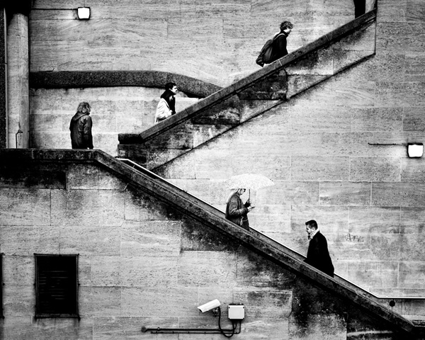 Alan Schaller,英国摄影师,现居伦敦,擅长黑白摄影,画面富有抽象的几何感、高对比度,作品曾刊登在《金融时报》、《独立报》等。 这组作品名为Metropolis(大都会),美国的一项调查显示,1985年以来没有亲密朋友的人数增加了两倍,现在的人越来越孤独,Schaller说:“从巴黎、东京到圣保罗,虚拟的数字连接正逐步取代现实的人际关系,我们迷失在社交媒体中,共同生活在城市里,却忘了真实的生活。” “在创作《大都会》这个系列前,我拍了很多肖像摄影和更为传统的街头摄影,我希望将创作带往另一个方向。经过一段时间的思考和实验,我决定在几何形状、光线和抽象的背景下展现人们的生活。 整个系列的拍摄持续了两年,其间运用了我所有关于摄影的技巧,需要大量的时间去摸索拍摄感受,构建画面。” “《大都会》这个系列与通常意义的街头摄影不同之处在于,照片的重点不再是人物和他们的表情,而在于人与人之间的关系和他们所处的空间,拍摄的目的是传达一种情绪或舞台感。” “该系列的大部分作品都不是摆拍。我在街头拍摄时,总会发现最好的照片来自人们的真实反应,我会去寻找一个有潜力拍摄地,耐心等待看会发生什么。 即使是陌生人,等待他和你的眼神接触也可能会提升这幅作品,这会在看照片的人和被拍的人之间建立连接。实际拍摄时,很少有人会因为被拍生气,我用的徕卡相机很小,很安静(Schaller是徕卡的形象大使)。” “通过光影,Schaller将我们带入一座无名城市的中心,我们不知道画面上的面孔属于谁,他们在城市中将自己隐入黑暗。” Alan Schaller |