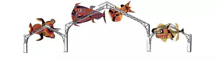 Miàs用艺术家César Manrique设计的鱼做成拼贴来解释屋顶的概念,以此来表现他希望这栋建筑所体现出的气质