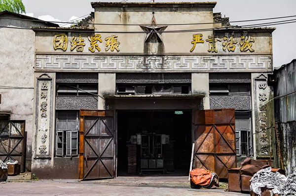 三面红旗作为门柱是时代特色。