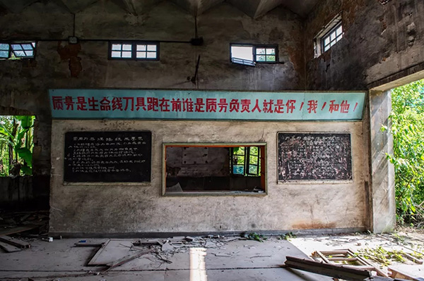 “备战、备荒、为人民”的标语依稀可见。 20世纪60-80年代,在中国中西部的13个省、自治区进行了一场以战备为指导思想的大规模国防、科技、工业和交通基本设施建设,史称三线建设。 上海在安徽皖南和浙西地区建立的小三线,是全国各省区市小三线中门类最全、人员最多、规模最大的综合性后方工业基地。在1965-1988年期间,7 万余名上海职工和家属,远赴皖南和浙西开山炸石、架桥修路,在那里的深山密林中建成了81家企事业单位。 2015年底,摄影师刘洪、马春雷开始关注小三线这个题材,并于2016年3月深入皖南和浙江山区,走进三线进行拍摄。随后的一年半时间里,由刘洪、马春雷、孙学杰、吕家富、丁林、张霞组成六人创作小组,对残留的历史遗迹用纪实的眼光全面地记录,为即将消失的这段历史留下最后的影像。