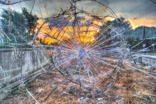 你也可以另辟蹊径,聚焦玻璃表面的纹路,尤其是裂纹。 不规则的同心状纹路,在聚焦、放大后如图一幅抽象画;搭配色彩比较绚丽的背景(比如说,蓝天或者日落),会产生一种奇异的美: