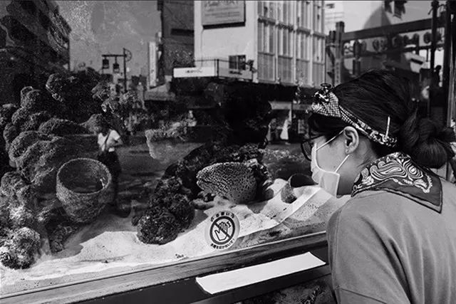 利用倒影 玻璃的倒影,也是街拍中常用的套路。这里说的可不光是“人在一边,景在另一边”的对称式构图,也不是“照镜子”式的只拍倒影不拍实景。 通过不断调整拍摄角度,你可以拍出“虚实景叠加”的效果,为画面增加纵深感,并提供更多的场景信息。 以下图为例,拍摄的是一名正隔着鱼缸看鱼的女性,但摄影师通过调整角度,让鱼缸上出现了街道的倒影,既增加了纵深感又补充了场景信息。