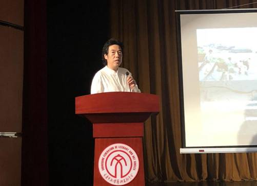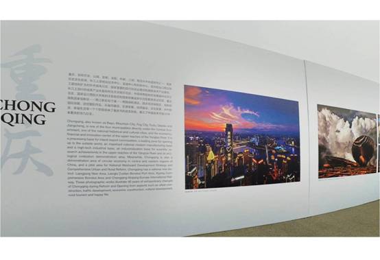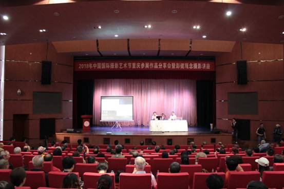 《中外摄影对着拍》——庆祝中国改革开放40年摄影展现场 2018国际摄影节展:与新时代同行 本次讲座中还重点分享了一些参加2018中国国际摄影艺术节暨中国第17届国际摄影艺术展览的作品。2018国际摄影节展是由中国摄影家协会、郑州市人民政府共同主办,于2018年5月18日在河南郑州举办。展览主题为"2018与新时代同行",举办多个展览——中国第17届国际摄影艺术展览、2018郑州影像双年展,组织9项活动,设置20个版块,展出来自国内外400余位摄影师的1300余幅作品。其中《中外摄影对着拍》——庆祝中国改革开放40年摄影展板块,重庆参展区作品从城市建设、交通发展、经济建设、文化发展、乡村旅游、幸福生活等方面反映了重庆市的改革新貌,展示了中国改革开放40周年来重庆的非凡巨变。