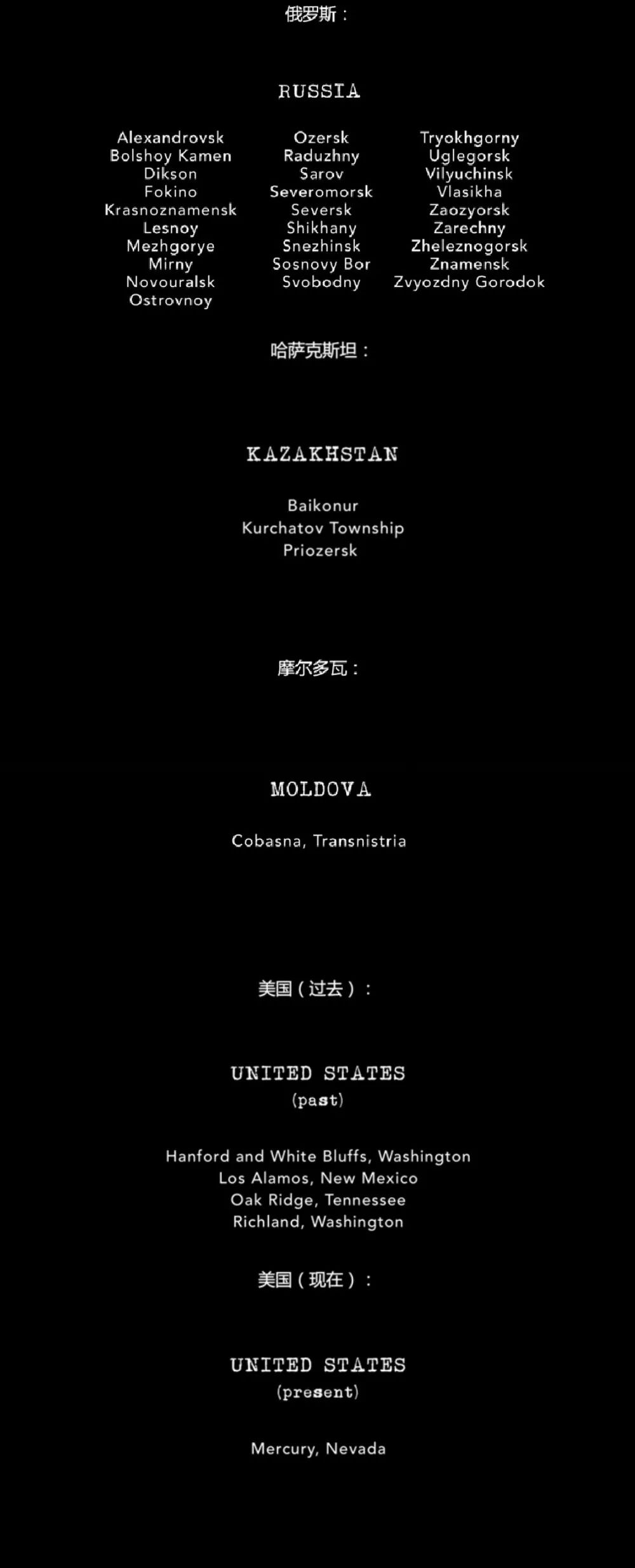 关于核工业的重要性,普京这么说: 它 为了获得安全感,就理所应该牺牲人民的健康? 为了保住大国地位,就可以肆无忌惮地污名化人权斗士? 这样正义凛然的说辞不免让人背脊发凉,鱼叔还清楚地记得,2011年日本福岛核电站发生过重大核泄漏事故。 当时,有些人不无夸张地担心,邻国飘来的云雨会不会腐蚀我们的国土和身体? 异国的我们尚且如此担忧,更别提身处核基地的居民,面对的是什么非人的环境。 所以,应该肯定《第40号城市》的意义,(((38)))勇敢地揭开了国家的黑幕,希望能帮助居民的人权失而复得。 片尾字幕更加震撼, 「第40号城市」不是第一个,也不是最后一个秘密城市;这些已知的秘密城市,又注定只是冰山一角。