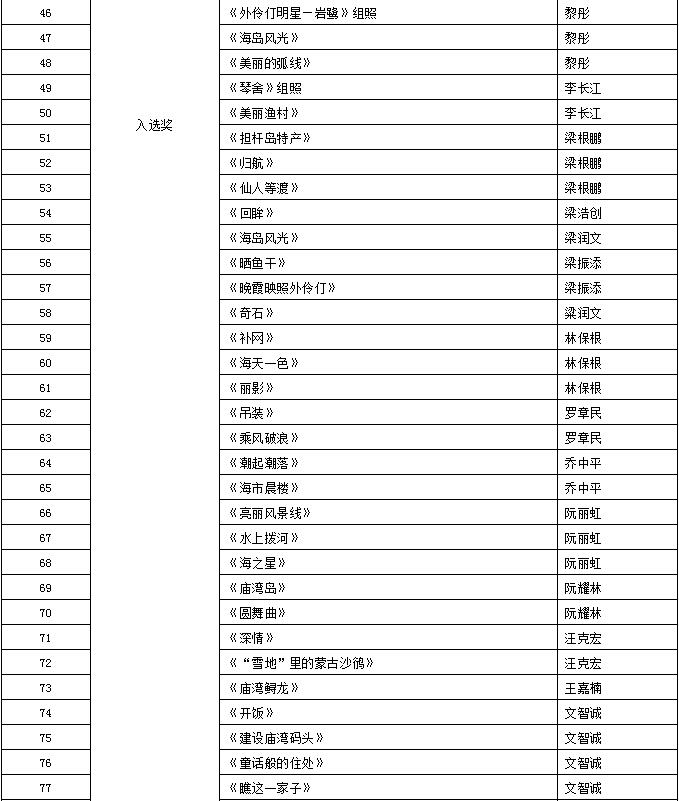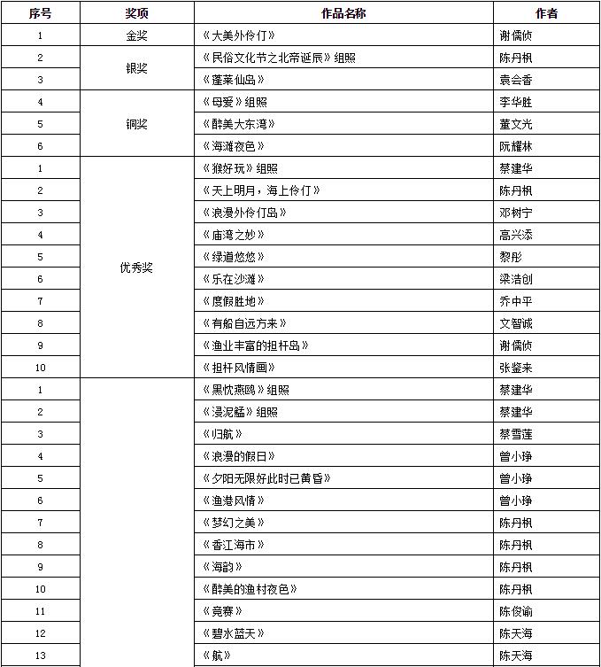 | 作为“第六届珠海文联文艺展示月”重点活动,由珠海市摄影家协会、珠海市担杆镇文化中心、珠海市担杆佳蓬旅游有限公司主办的《大美担杆 风情海岛》摄影大赛于2018年10月31日在斗门区文化馆进行评选。本次摄影大赛共收到97名作者1138幅(组)作品。经评委(马刚、梁力生、冯振伟、刘干文及担杆镇相关部门负责人)评选,评出金奖1名、银奖2名、铜奖3名、优秀奖10名、人选奖100名。 |