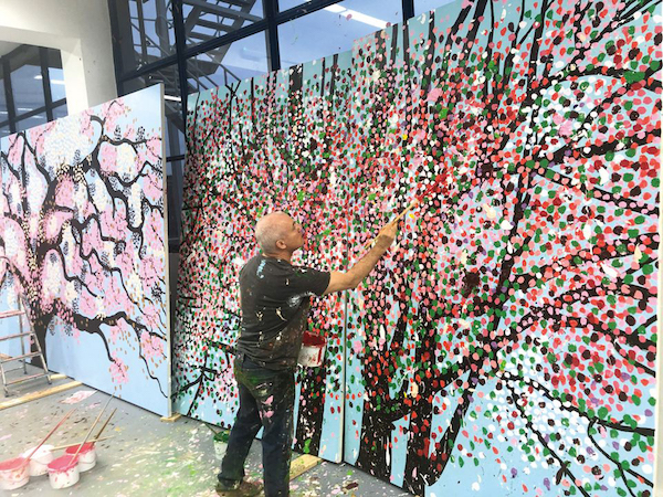 达明·赫斯特正在进行“樱花”系列创作 近日,《The Art Newspaper》在英国知名艺术家达明·赫斯特(Damien Hirst)位于伦敦泰晤士河畔的工作室中对这位艺术家进行了一次采访,其中提及了他最近正在创作的“樱花”系列。 赫斯特在采访中表示,“樱花”系列的灵感始于“面纱”画(Veil Paintings)的创作。“当时,我觉得这些画比较抽象,而我试图穿过它们,看到一些背后的东西,就像是从一扇脏兮兮的窗看出去那样。这些画既是模糊的,又透露着什么,它们开始看起来像花一样。”然后,赫斯特想到,也许他可以索性画些樱花。“它们看上去很俗气,就像是一场大型的庆祝活动,但又透着死亡的寓意。”于是,赫斯特开始在画面上添上树枝,“一开始它们看起来像是糟糕的霍克尼仿作,”赫斯特说道,不过,随着不断添减,他逐渐找到了感觉。“它们像是介于抽象与具象之间。” 赫斯特此前的许多作品创作都有助手的参与,“对我来说,艺术家是否亲自创作从来不是个问题,不管是不是你做的,只要最终结果是你想要的就行了。”赫斯特在采访中说道,不过,对于“樱花”系列,这位明星艺术家却是“亲力亲为”。 樱花短暂的花期常常使人将其同死亡联系在一起,但是在赫斯特看来,一切事物中都同时蕴含着生与死。“我很喜欢马克斯·贝克曼(Max Beckmann)说他在画画时,总是将画布事先准备成黑色的,因为他将黑色视为虚无,而他画下的每一笔都成了介于他自己和虚无之间的东西,”赫斯特说,他所画的樱花也是如此,“色彩是逃避黑暗的路。” 达明·赫斯特(Damien Hirst)1965年出生于英国布里斯托尔,1995年获得英国当代艺术大奖特纳奖,是目前英国成交价最贵的当代艺术家之一,也是国际公认的英国最具影响力的艺术家。据报道,他此前对科学和艺术之间的联系很感兴趣,常常往自己的作品中注入医学的元素,比如药品,药橱和药片等。而对于生物生命的有限性他也兴趣浓厚,他最著名的“自然历史”系列作品由动物尸体组成,部分作品还经过切割,保存在甲醛容器中,比如作品《生者对死者无动于衷》。 (文/钱雪儿) 上海 | 意大利摄影家马西莫·李斯特里 圣殿摄影师,用镜头讲述空间的故事