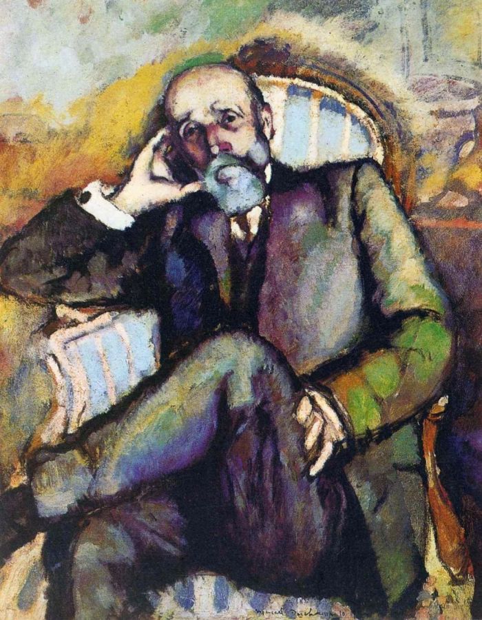 亚威农少女 毕加索 1907 年 那是一个艺术运动风起云涌的年代,两位兄长积极投身其中,与许多前卫艺术家们保持着密切联系,杜尚自然可以轻易进入这个看似前卫的圈子。 之后的 6 年间,他尝试了各种绘画风格,并成为巴黎先锋派艺术家沙龙的成员,有资格参加每年一度的全国展览。从 1910 年完成的《父亲肖像》中可以看出,他正受后期印象派影响,对塞尚的画风着迷。
