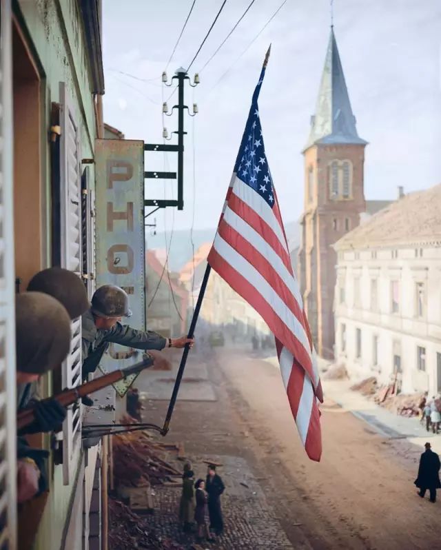 1945年,法国,一位美国士兵在楼房内举起一面星条旗。