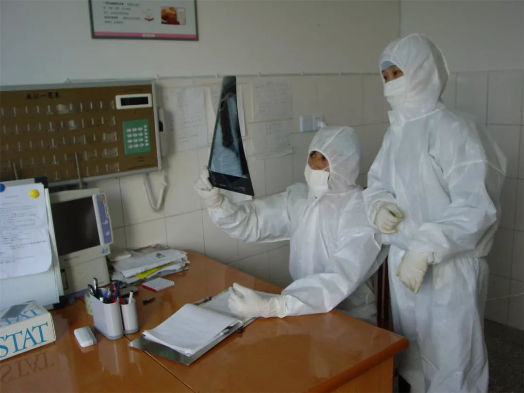 2003年,非典型肺炎的诊断主要依靠胸片。 2020年,海宁市人民医院建立与浙一医院的远程会诊,指导一线诊治。 2003年,在刚刚改建的简易隔离病区内,护士正查房测量体温。