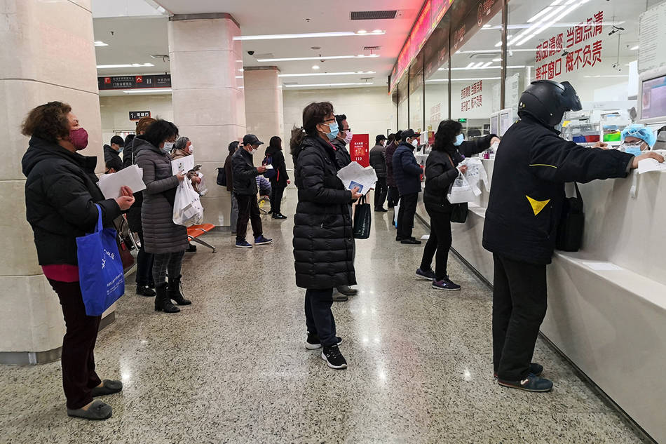 2020年3月27日,樱花季里被誉为“上海最美公交车站”的南浦大桥公交汽车站45路终点站,一对母女从车上走下。 Q: 介绍你在疫情期间拍摄到自己最喜欢的一张照片,你是怎么拍下它的,这张照片你想传达什么? A:我最喜欢的这张照片拍摄于2月26日上午上海市第九人民医院取药处,等候领药的人们排队时自觉拉开相互间的距离,秩序井然。一眼望去,无声地表露了人们小心翼翼的防疫之心。我随即用手机退后两步,从侧面拍下了这一场景。感觉疫情之中,人们通过自己的自觉行动讲述着保护自己,也就是保护他人。
