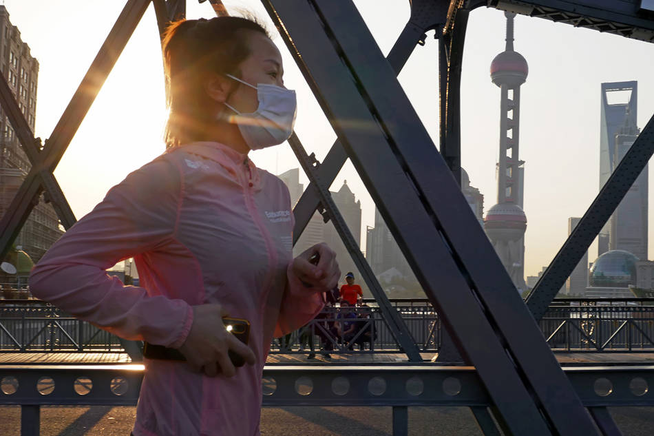 2020年4月8日,上海外白渡桥上,一位晨跑的女孩。