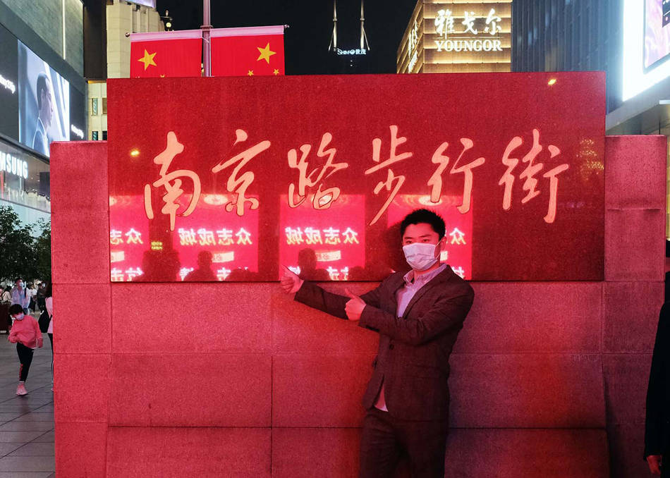 2020年5月1日,夜晚的南京路步行街,一名小伙子双手翘着大拇哥在“众志成城”倒映的街名墙前留影。