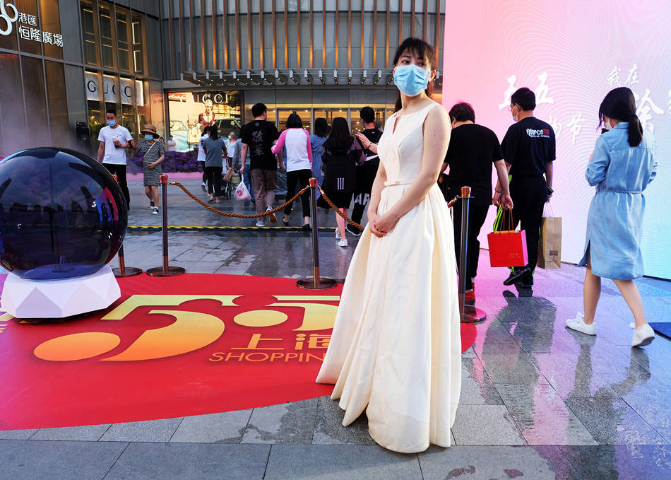 2020年5月4日,徐家汇商圈当晚开幕的“五.五购物节”上,礼仪小姐戴口罩上岗。